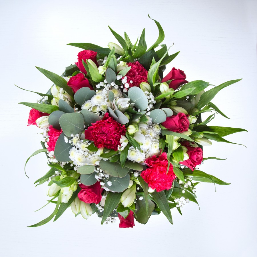 Experience the timeless elegance of our Luxurious Red Roses & White Blooms Bouquet. This unique arrangement combines deep red roses with delicate white chrysanthemums and gypsophila, creating a visually stunning and sophisticated display.