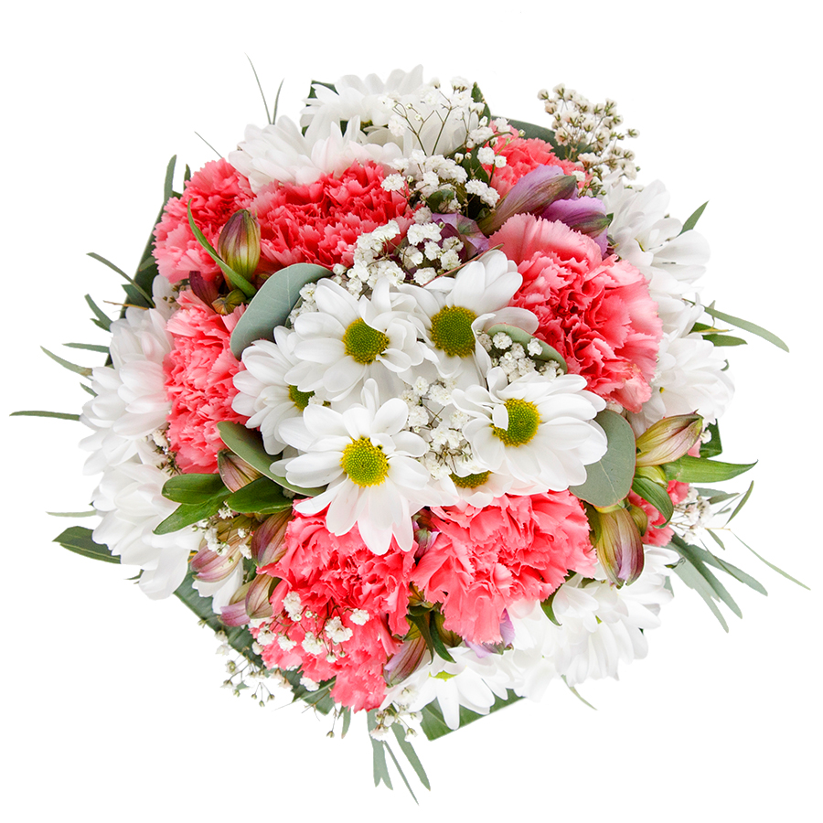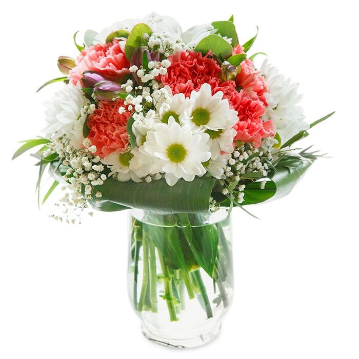 Delight in the subtle sophistication of our seasonal floral arrangement. This captivating bouquet features pristine white chrysanthemums, delicate gypsophila, and tender light pink carnations, all gracefully harmonized with fresh aspidistra leaves.